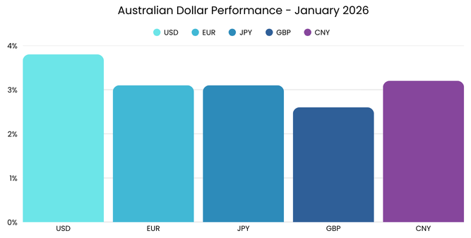 The Australian dollar delivered another strong month, with the trade-weighted index reaching its highest level in over four years. Persistent domestic inflation and resilient employment have reinforced expectations that Australian interest rates will remain relatively elevated, increasing the currency’s attractiveness to yield-seeking investors.